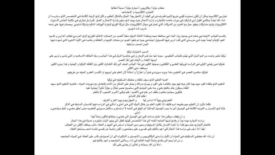 نماذج لخطاب النوايا / خطاب الدوافع للمنحة التركية: