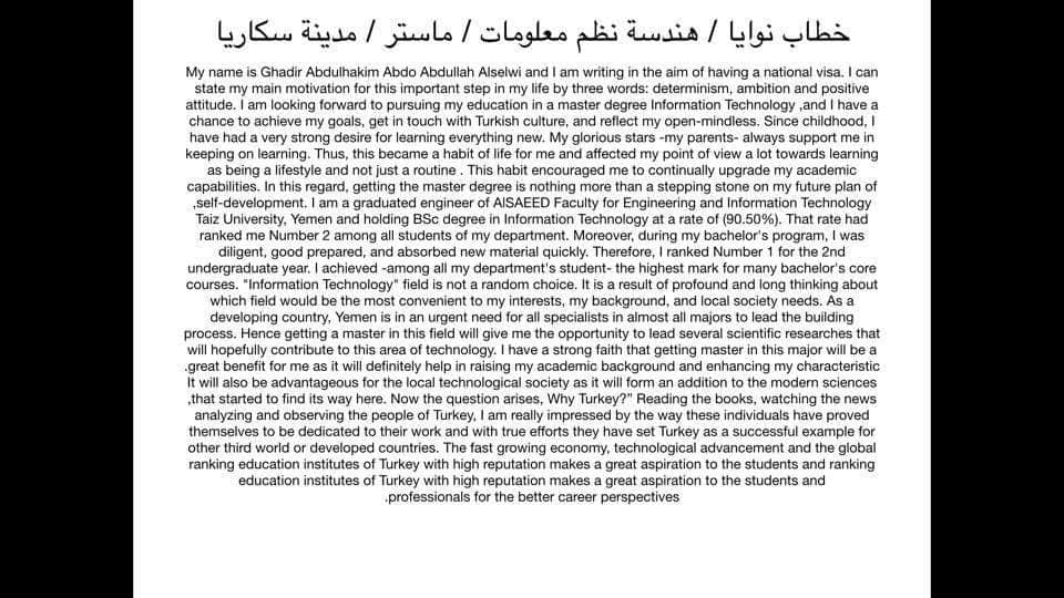 - أهمية خططك المستقبلية لتعليمك ومنحتك الدراسية في تركيا. يمكنك كتابة خطاب النوايا باللغة التي يمكنك التعبير عنها بنفسك.