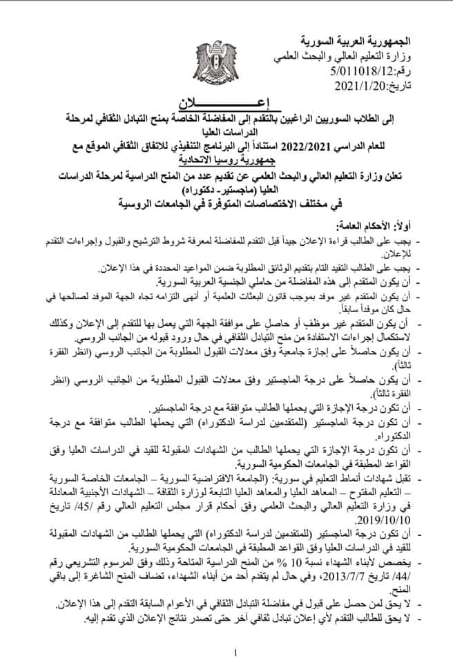 قامت وزارة التعليم العالي والبحث العلمي السورية استناداً للاتفاق الثقافي الموقع مع جمهورية روسيا الاتحادية بالاعلان عن عدد من المنح الدراسية للدراسات العليا (ماجستير – دكتوراه) ضمن الجامعات الروسية تحت إطار التبادل الثقافي.