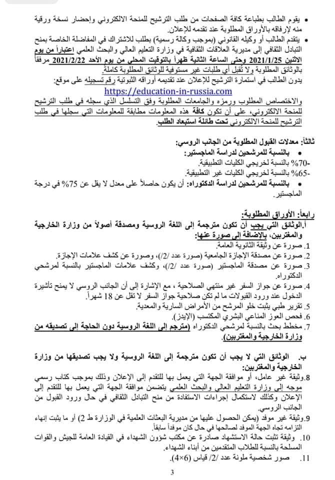 وقد نشرت الوزارة على موقعها الأحكام العامة التي يجب على الطالب السوري اتباعها قبل التقدم للمفاضلة على منحة الحكومة الروسية لمعرفة شروط الترشيح والقبول وإجراءات التقدم نرفقها فيما يلي:
